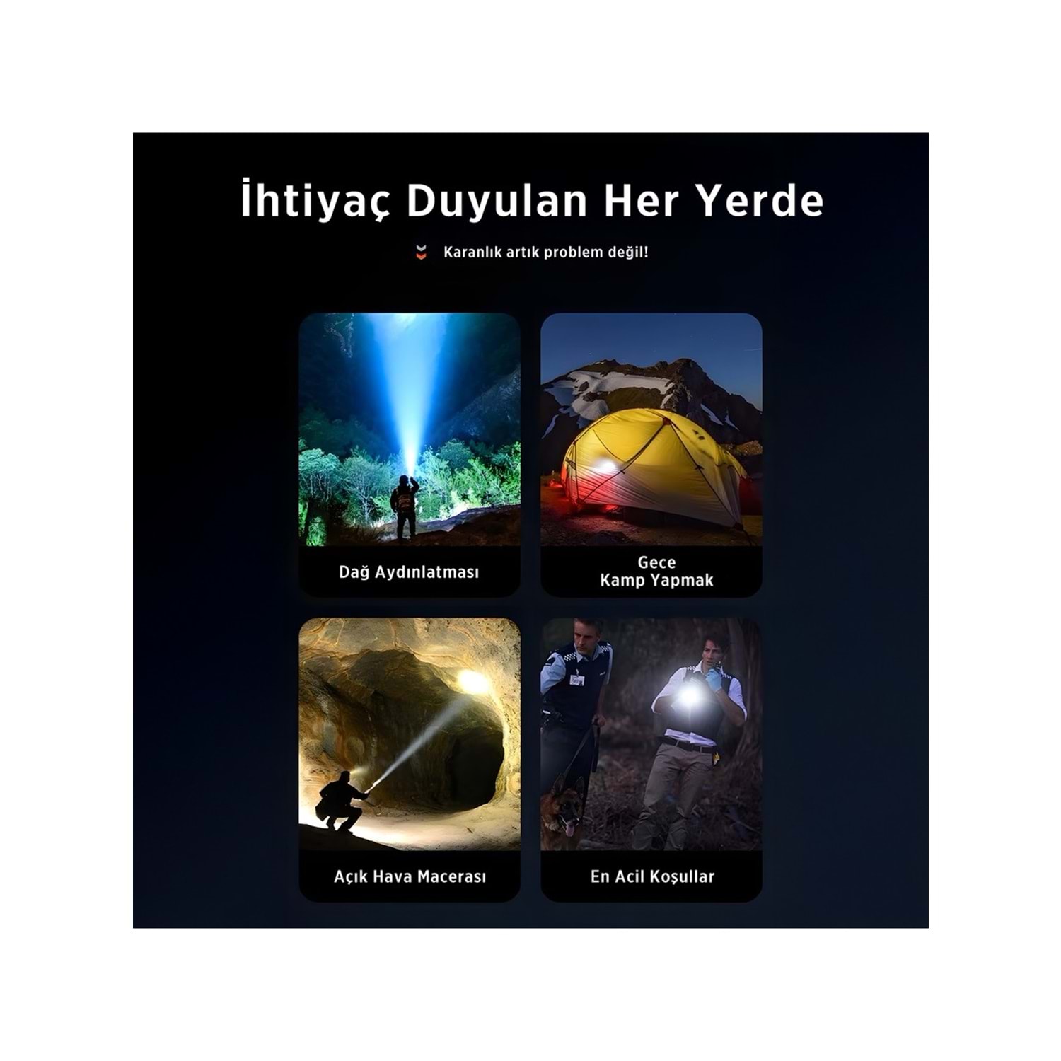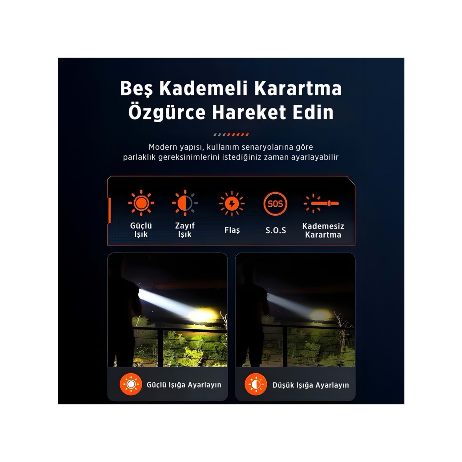 El Feneri, Üç Farklı Aydınlatma Moduyla Esneklik Sağlar: Normal Mod, Gündelik İhtiyaçları Karşılarken; Kademesiz Karartma Modu, Işığı İhtiyacınıza Göre Ayarlama Olanağı Sunar. Mod İse Acil Durumlarda Sos Flaş Fonksiyonuyla Dikkat Çeker. Uzun Menzilli Ve Uzak Mesafeleri Aydınlatma Mesafesiyle Bu Fener, Kamp, Doğa Yürüyüşleri Ve Profesyonel Kullanım Gibi Çeşitli Aktivitelerde Vazgeçilmez Bir Yardımcıdır.