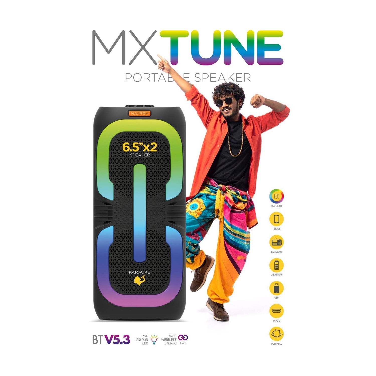 Maxron MXTUNE, evde, bahçede, partilerde veya arkadaş buluşmalarında güçlü ses ve pratik kullanım için ideal bir hoparlördür.