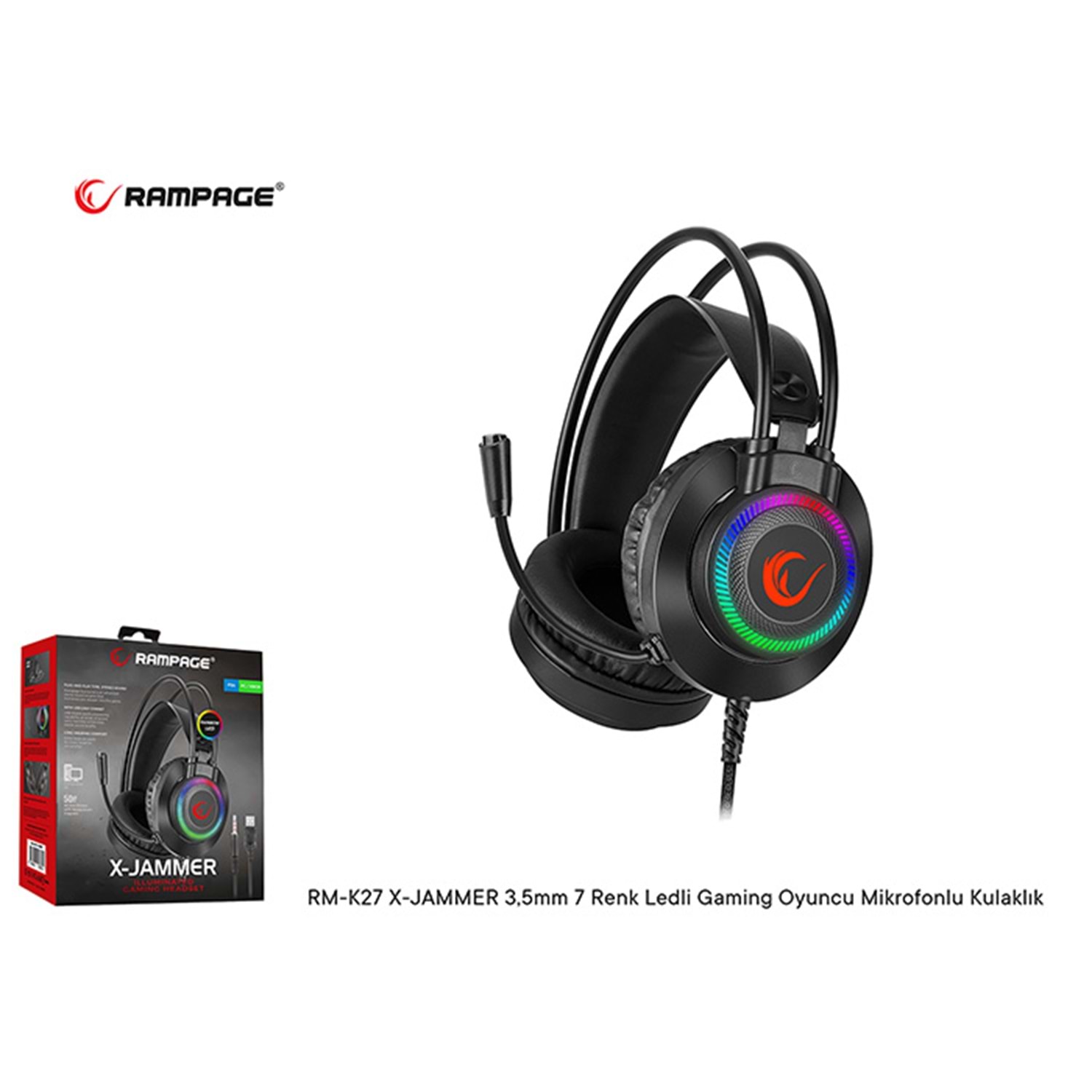 Rampage RM-K27 X-JAMMER 3,5mm 7 Renk Ledli Gaming Oyuncu Mikrofonlu Kulaklık ; Ergonomik tasarımı sayesinde uzun kullanımlarda kulaklarınızı rahatsız etmez ve yüksek kaliteli mikrofonu ile internette sorunsuz bir şekilde sesli sohbet etmenize imkan tanır. Hassas yapısı ile dışa ses sızdırmaz. Uzun kablosu diğer kulaklıklara nazaran rahat hareket etmenizi sağlar. Rainbow Ledli yan yüzeyi sayesinde mükemmel bir görünüm sağlar. PS4 / PC / XBOX cihazlarınızda kolaylıkla kullanabilirsiniz.